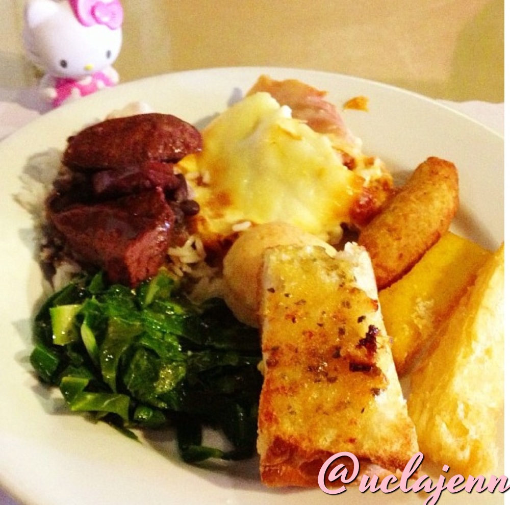 First up at the feast were the offerings from the buffet and salad bar! From the hot buffet, I tried, the Lasagna, Rice cakes, Polenta, Yucca, cheese bread and garlic bread, Collard greens, Beef stroganoff, Black beans, Feijoada black bean stew and Yucca flour. From the salad bar, I got the Lime and cilantro coleslaw and potato