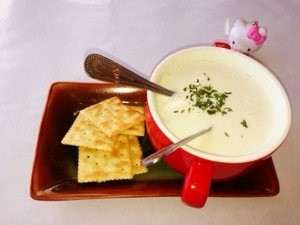 From the “Drive to the Ocean,” my friend got their newest soup offering, clam chowder. A very hearty looking bowl of thick clam chowder was presented to my friend. It was accompanied with some crispy crackers.