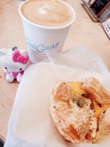 I walked in to Two Guns Espresso and found myself in a small and simple coffee shop. After quickly scanning the menu, I chose to get a flat white and a egg muffin pie.