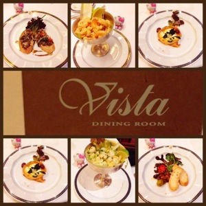 go-ers like myself had the special treat of fine dining at the lovely Vista Dining Room. Located on the third deck of the cruise ship, Vista Dining Room is a nice, spacious dining area with wooden decor and a beautifully lit ceiling.