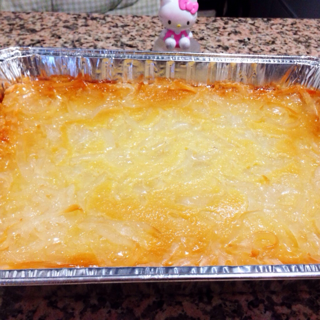 Ingredients she used for this sweet dessert are: 2 packages of grated cassava, 2 cans coconut milk, 1 can condensed milk, 4 eggs and macapuno strings.