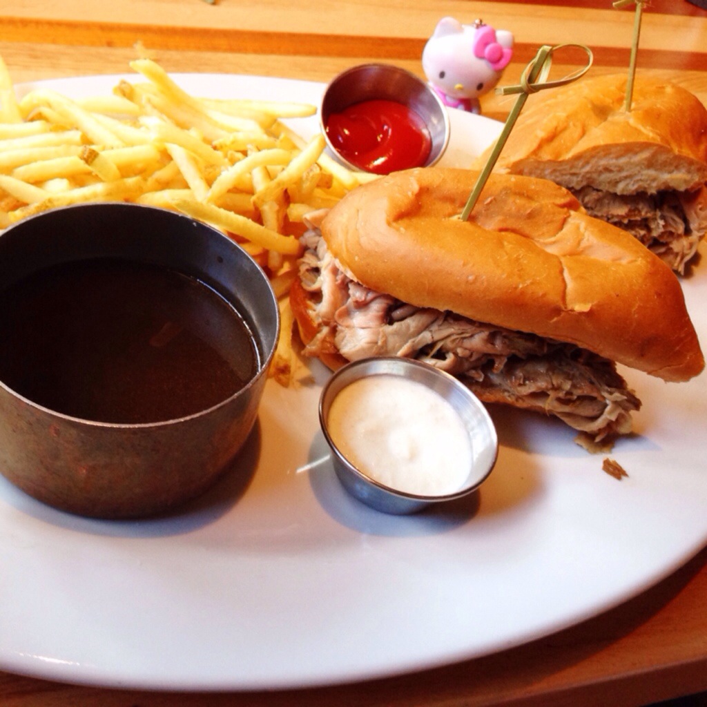 For my entree, I got the prime rib dip. I’ve had my eye on that sandwich ever since my first trip here and since I couldn’t eat it then, I had to try it this time around. It was one packed sandwich with plenty of tender shaved prime rib. It came with an awesome rich beef jus for dipping and crispy shoestring fries on the side. The bread of the sandwich was hot and fresh and the prime rib was slow roasted to perfection. It was hearty, meaty and yummy.