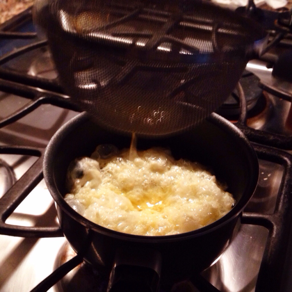 Similar to the start of making any kind of omelette, the first step here is to crack the eggs into a bowl and whisk the egg mixture in the bowl. However instead of simply pouring the egg mixture into a frying pan, the chef from Le Cordon Bleu had a different technique. He used a strainer to pour the egg mixture through and lower it into the pot. I tried this technique this morning.