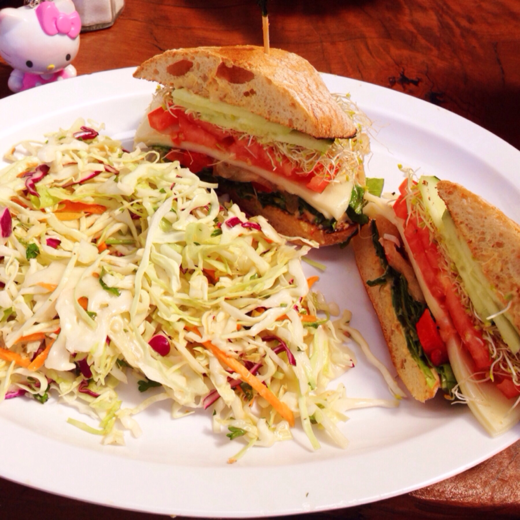 The “Tree hugger” is vegetarian sandwich with hummus, roasted red peppers, caramelized onions, provolone cheese, arugula, sprouts, cucumbers and maple cider. I got it with a side of their homemade cole slaw. I loved the tasty, hearty and healthy sandwich full of fresh ingredients! Hello Kitty a Foodie is a tree hugger (fan) for life π