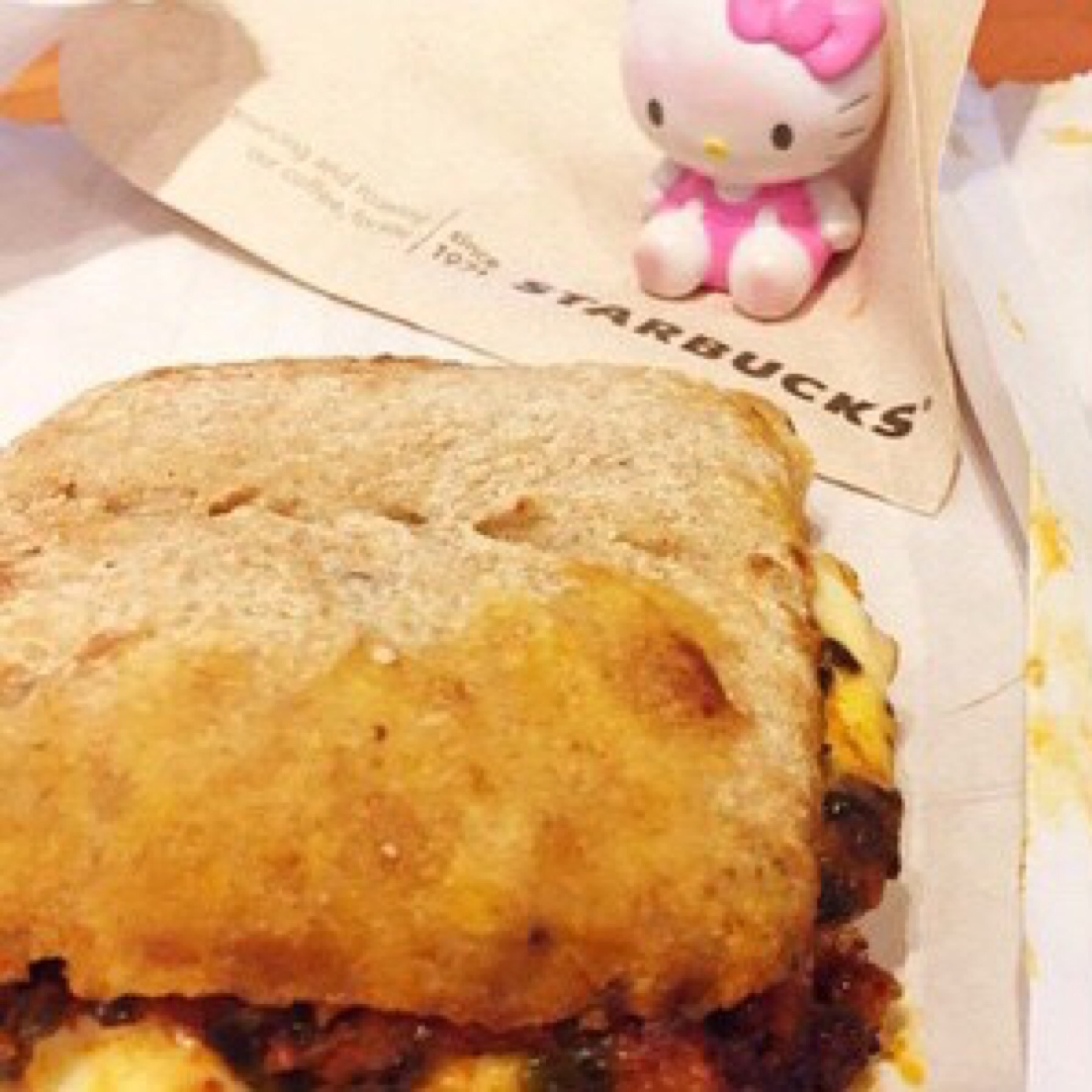 The pistachio drink definitely made my morning but I got another pleasant treat with a free breakfast sandwich! I got the vegetable and fontina go breakfast sandwich! It’s a delightful vegetarian sandwich. It has spinach, sundries tomatoes, caramelized onions and Fontiago cheese on a multigrain ciabatta bun.