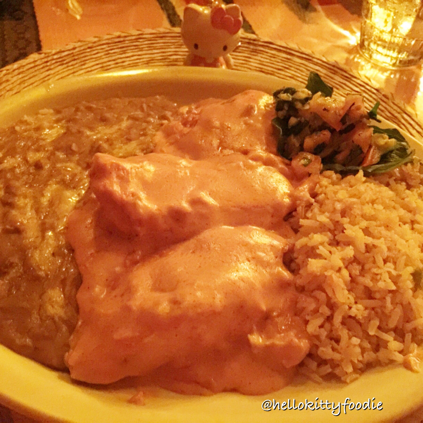 Soon after was our main entrees! As I mentioned earlier, I chose to get the chicken a la creama. This dish was indeed “borrrrrrrn in the sauce.” Two and half large pieces of chicken were covered in the creamiest sauce ever. The cream was light and just slightly sweet. It was so delicious and has this Hello Kitty Foodie salivating just at the thought of this dish. It was accompanied with refried beans, rice and salsa.
