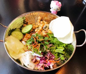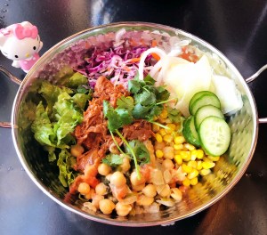 The Zen bowl is a vegetarian delight consisting of bbq pulled jackfruit, coconut ginger chickpeas, shallot ginger rice, streetside corn, Asian slaw, pickled daikon-carrot-papaya, cucumbers, fresh shallots and cilantro. I love how the jackfruit is tender just like shredded chicken. The bowl is wonderfully healthy and truly does bring some zen ;).