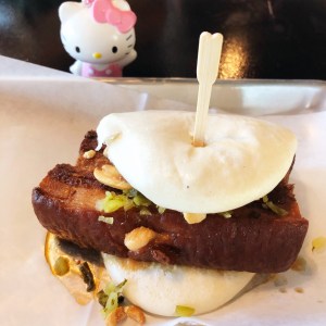 This savory bao has a large Kakuni-style braised pork belly topped with Taiwanese relish and roasted peanuts! I love how it has crisp roasted peanuts. It gives a nice, crunchy touch to the bao.
