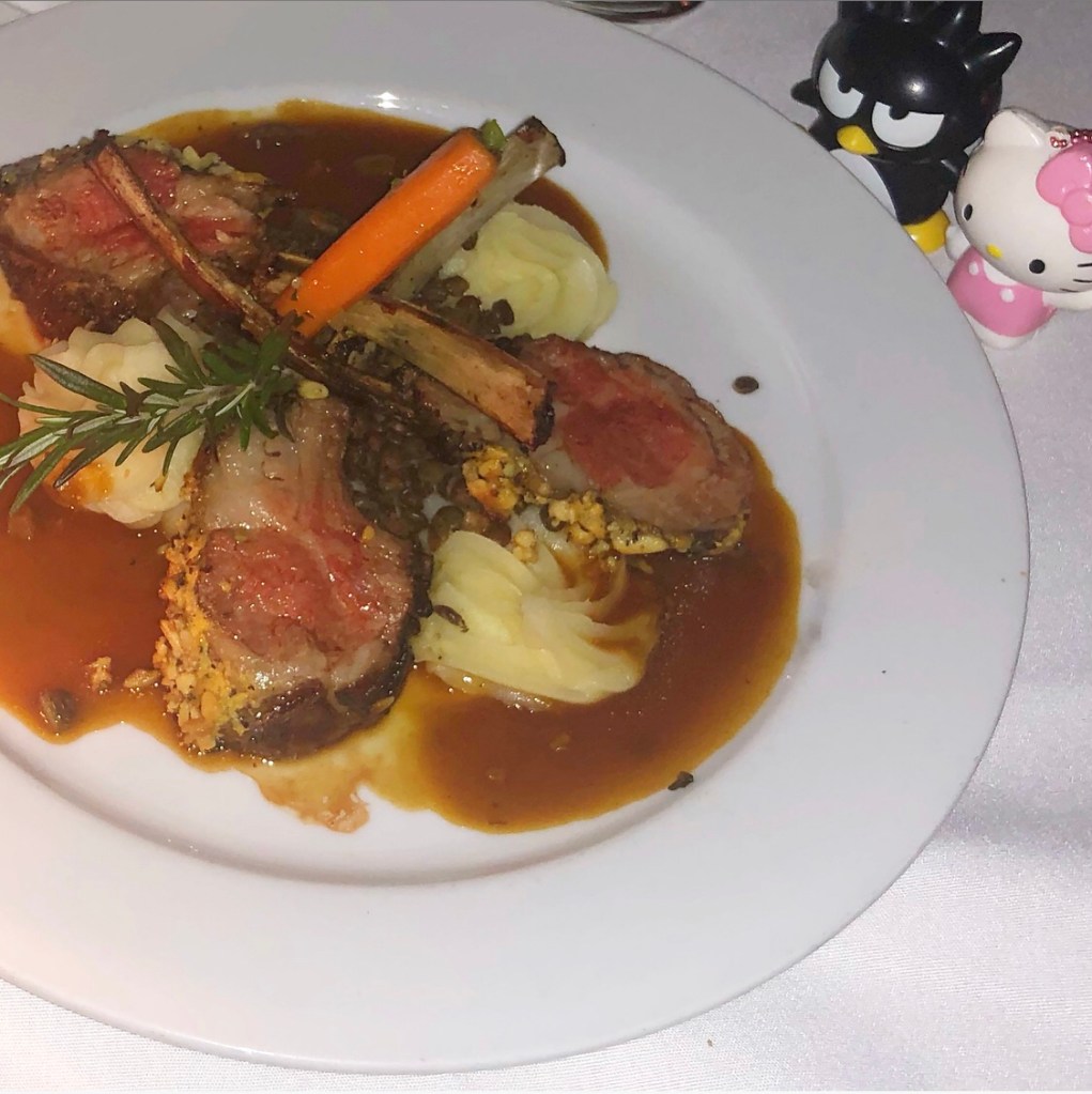 My boyfriend had an equally delightful dish via The Mustard and Pine Nut Crusted Rack of Lamb with Madera Wine & Smoked Garlic Demi Glaze.