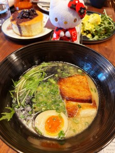 A comforting bowl of soy-flavored pork broth, tender pork belly, a perfectly cooked egg, mizuna greens, and a drizzle of black garlic oil. This dish beautifully captured the essence of traditional Japanese ramen while feeling fresh and innovative.