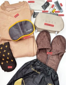 Of course, the flight wasn’t just about the food. My business class cube made the experience even more comfortable—a full-flat seat, a handy storage box, and a 15-inch personal screen. The storage box included an Asian face mask, headphones, and a water bottle, and the generous vanity kit had an eye mask, toothbrush, comb, lip balm, earplugs in a mini pouch, moisturizer, and socks. Shortly after takeoff, I was delighted when the flight attendant brought me soft pajamas and cozy slippers.